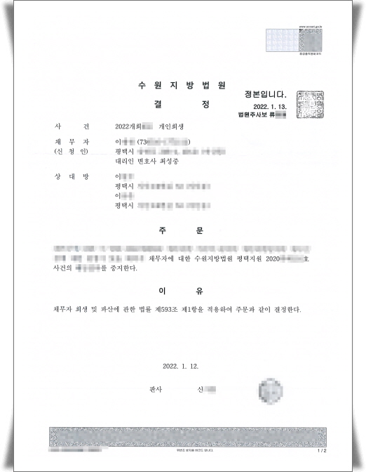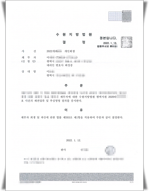 °³ÀÎȸ»ýÀ» ½ÅûÇÏ¸é¼ Ã¤±ÇÀÚ°¡ ÁøÇàÇÑ °Á¦ÁýÇàÀ» ÁßÁöÇÏ´Â ½ÅûÀ» ÇÏ¿© ¾Æ·¡¿Í °°ÀÌ ÁßÁö¸í·É°áÁ¤À» ¹Þ¾Ò½À´Ï´Ù.