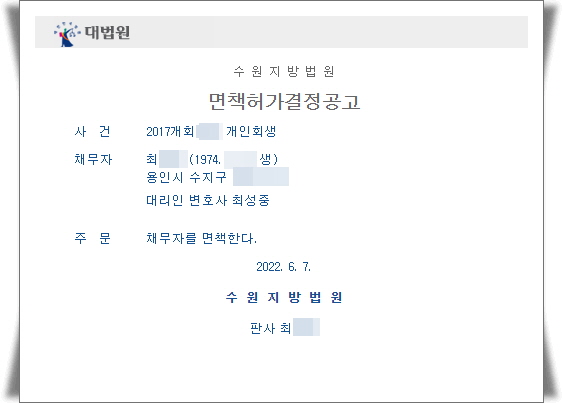 ÀÌÈÄ º¯Á¦¸¦ ¿Ï·áÇÑ ÈÄ ¼ö¿øÈ¸»ý¹ý¿ø¿¡ ¸éÃ¥½ÅûÀ» ÇÏ¿´°í, ¾Æ·¡¿Í °°ÀÌ °³ÀÎȸ»ý ¸éÃ¥°áÁ¤À» ¹Þ°Ô µÇ¾ú½À´Ï´Ù.