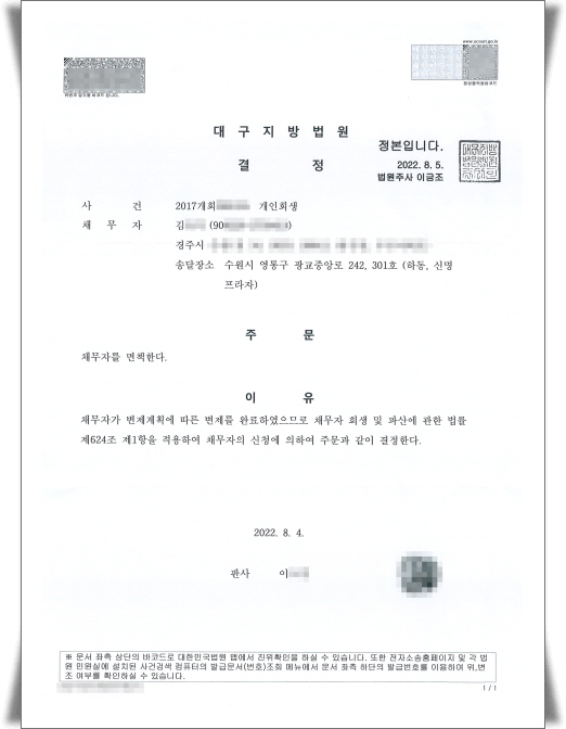 ÀÌÈÄ º¯Á¦°èȹ¿¡ µû¸¥ º¯Á¦ÀÇ ¼öÇàÀ» ¸¶Ä¡°í, ¾Æ·¡¿Í °°ÀÌ ´ë±¸Áö¹æ¹ý¿ø¿¡ ¸éÃ¥½ÅûÀ» ÇÏ¿© 乫¸¦ ¸éÃ¥ÇÑ´Ù´Â °áÁ¤À» ¹Þ°Ô µÇ¾ú½À´Ï´Ù. ÀÌ ¸éÃ¥°áÁ¤¿¡ µû¶ó ÀÇ·ÚÀÎÀÌ °³ÀÎȸ»ýÀ¸·Î º¯Á¦ÇÑ Ã¤¹«¸¦ Á¦¿ÜÇÏ°í ³ª¸ÓÁö º¯Á¦ÇÏÁö ¸øÇÑ ÀºÇà, ÀúÃàÀºÇà, ´ëºÎ¾÷ü, ±×¸®°í ½Å¿ëÄ«µå 乫±îÁö ¸ðµÎ ÅÁ°¨À» ¹Þ°Ô µÇ¾ú½À´Ï´Ù(´Ü, °³ÀÎȸ»ý ä±ÇÀÚ¸ñ·Ï¿¡¼ ºüÁø 乫´Â ¸éÃ¥ÀÇ È¿·ÂÀÌ ¹ÌÄ¡Áö ¾Ê½À´Ï´Ù. ).