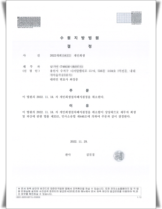 ÀÌÁ¦ ´Ù½Ã Áï½ÃÇ×°í¸¦ ÇÏ°í ´Ù½Ã È¸»ýÀýÂ÷¸¦ ÁøÇàÇÏ¿© ¾Æ·¡¿Í °°ÀÌ °³ÀÎȸ»ýÀýÂ÷ÆóÁö°áÁ¤À» Ãë¼ÒÇÑ´Ù´Â °áÁ¤À» ¹Þ¾Ò½À´Ï´Ù.