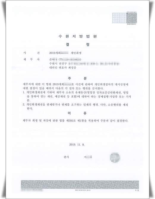 ¼ö¿øÁö¹æ¹ý¿ø ±ÝÁö¸í·É°áÁ¤ ¡ß »ý ³â : 1975³â »ý¡ß ÁÖ¼ÒÁö : °æ±âµµ ¼ö¿ø½Ã¡ß ¼ÒµæÈ°µ¿ : °³Àλç¾÷ÀÚ¡ß »ç°ÇÁ¢¼ö : ¼ö¿øÁö¹æ¹ý¿ø ¡ß ƯÀÌ»çÇ× : ½ÅûÀÎÀº ÀÛÀº ½Ä´çÀ» ¿î¿µÇÏ´Â °³Àλç¾÷ÀÚ·Î »ç¾÷ºÎÁø°ú ¿î¿µÀÚ±Ý µîÀ¸·Î »ç¿ëÇÑ Ã¤¹«ÀÇ Áõ´ë·Î °³ÀÎȸ»ýÀ» ½ÅûÇÏ°Ô µÇ¾ú½À´Ï´Ù. °³ÀÎȸ»ý½ÅûÀ» ÇÏ¸é¼ »ç¾÷Àå º¸Áõ±Ý¿¡ ¾Ð·ù°¡ µé¾î¿À°Å³ª, »ç¾÷¿ë°èÁ µî ¿µ¾÷À» ÅëÇÏ¿© ¾ò´Â ä±Ç¿¡ ¾Ð·ù°¡ µé¾î¿À¸é ¿µ¾÷Ȱµ¿À» ÇÒ ¼ö ¾øÀ¸¹Ç·Î ¼ö¿øÁö¹æ¹ý¿ø¿¡ ±ÝÁö¸í·É½ÅûÀ» ÇÏ¿© ±ÝÁö¸í·É°áÁ¤À» ¹Þ¾Ò½À´Ï´Ù.