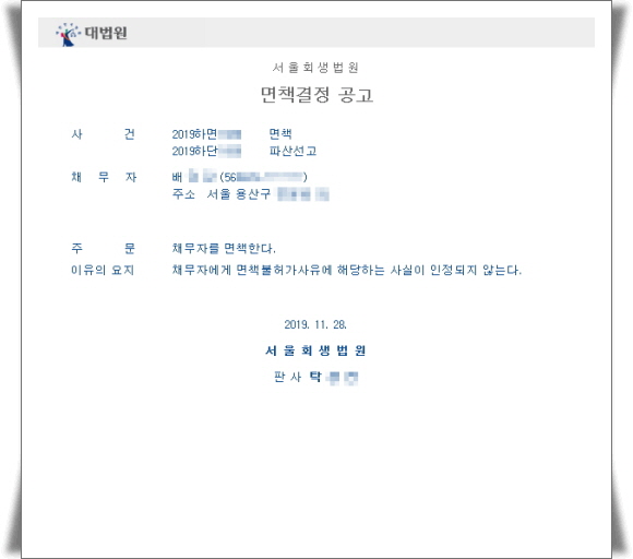 ¼¿ïȸ»ý¹ý¿ø °³ÀÎÆÄ»ê ¸éÃ¥°áÁ¤°ø°í ¡ß »ý ³â : 1956³â»ý¡ß °ÅÁÖÁö : ¼¿ïƯº°½Ã ¿ë»ê±¸¡ß 乫ÃÑ¾× : 554,456,787¿ø¡ß ½Åû°á°ú : 乫ÀüºÎ¸éÃ¥¡ß ¸éÃ¥°áÁ¤ÀÏ : 2019. 11. 28.¡ß ¸éÃ¥°áÁ¤°ø°íÀÏ : 2019. 11. 29. ¡ß ÁøÇà»çÇ× : ½ÅûÀÎÀÌ ¼¿ïȸ»ý¹ý¿ø¿¡ °³ÀÎÆÄ»êÀ» ½ÅûÇÑ ÈÄ, ¼¿ïȸ»ý¹ý¿ø¿¡¼ ÆÄ»ê°üÀçÀÎÀ» ¼±ÀÓÇÏ¿´°í, ÆÄ»êÆóÁö°áÁ¤ ÈÄ ¾Æ·¡°ú °°ÀÌ "乫ÀÚ¸¦ ¸éÃ¥ÇÑ´Ù." ¶ó´Â ¸éÃ¥°áÁ¤À» ¹Þ¾Ò½À´Ï´Ù. ÁÖ ¹®: 乫ÀÚ¸¦ ¸éÃ¥ÇÑ´Ù.