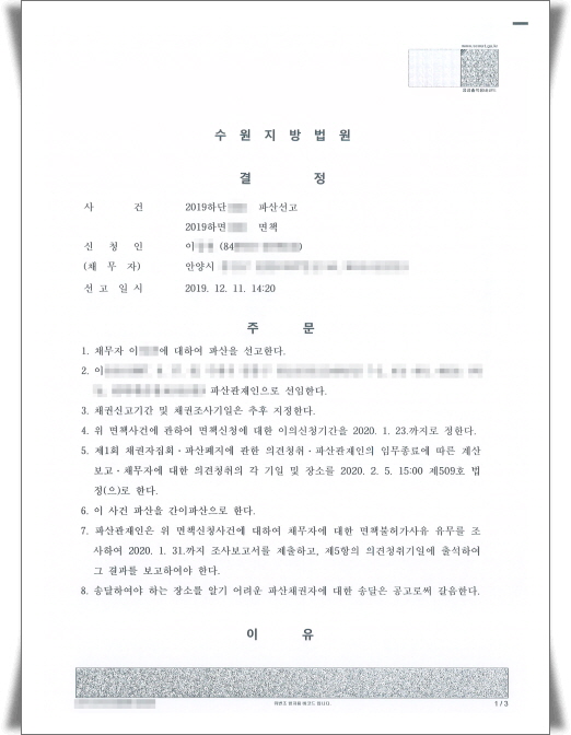 ¼ö¿øÁö¹æ¹ý¿ø¿¡¼´Â ½ÅûÀÎÀÇ °³ÀÎÆÄ»ê ¹× ¸éÃ¥»ç°Ç¿¡ ´ëÇÏ¿© Áö³ 12¿ù 11ÀÏ 14:20¿¡ ÆÄ»ê¼±°í¸¦ Çϰí, ½ÅûÀÎÀÇ »ç°ÇÀ» ´ã´çÇÒ ÆÄ»ê°üÀçÀÎÀ» ¼±ÀÓÇÏ¿´½À´Ï´Ù.
