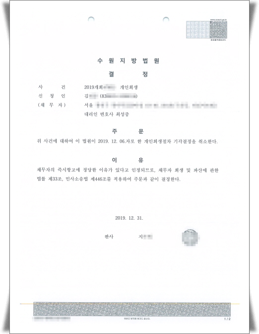 °³ÀÎȸ»ýÀýÂ÷ ±â°¢°áÁ¤À» Ãë¼ÒÇÑ´Ù."´Â °áÁ¤À» ¹Þ¾Ò½À´Ï´Ù.