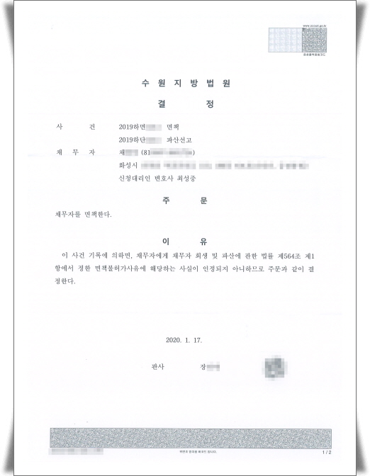 ¼¿ïȸ»ý¹ý¿ø °³ÀÎÆÄ»ê ¸éÃ¥°áÁ¤°ø°í ¡ß »ý ³â : 1981³â»ý¡ß °ÅÁÖÁö : °æ±âµµ ȼº½Ã¡ß 乫ÃÑ¾× : 103,582,646¿ø¡ß ½Åû°á°ú : 乫ÀüºÎ¸éÃ¥¡ß ¸éÃ¥°áÁ¤ÀÏ : 2020. 1. 17.¡ß ¸éÃ¥°áÁ¤°ø°íÀÏ : 2020. 1. 20. ¡ß ÁøÇà»çÇ× : ½ÅûÀÎÀº 乫Ãʰú ¹× Áö±ÞºÒ´ÉÀÇ »çÀ¯·Î ¼ö¿øÁö¹æ¹ý¿ø¿¡ °³ÀÎÆÄ»êÀ» ½ÅûÇÏ¿´½À´Ï´Ù. ¼ö¿øÁö¹æ¹ý¿ø¿¡¼´Â 乫ÀÚ¿¡ ´ëÇÏ¿© ÆÄ»ê°üÀçÀÎÀ» ¼±ÀÓÇÏ¿´À¸¸ç, ÆÄ»êÀýÂ÷ÆóÁö°áÁ¤ ÈÄ ¾Æ·¡°ú °°ÀÌ "乫ÀÚ¸¦ ¸éÃ¥ÇÑ´Ù." ¶ó´Â ¸éÃ¥°áÁ¤À» ÇÏ¿´½À´Ï´Ù. ÁÖ¹®: 乫ÀÚ¸¦ ¸éÃ¥ÇÑ´Ù.
