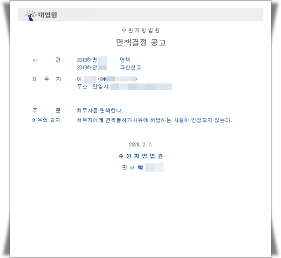 ¼ö¿øÁö¹æ¹ý¿ø °³ÀÎÆÄ»ê ¸éÃ¥°áÁ¤°ø°í ¡ß »ý ³â : 1984³â»ý¡ß °ÅÁÖÁö : °æ±âµµ ¾È¾ç½Ã¡ß 乫ÃÑ¾× : 30,246,875¿ø¡ß ½Åû°á°ú : 乫ÀüºÎ¸éÃ¥¡ß ¸éÃ¥°áÁ¤ÀÏ : 2020. 2. 7.¡ß ¸éÃ¥°áÁ¤°ø°íÀÏ : 2020. 2. 17. ¡ß ÁøÇà»çÇ× : ¾È¾ç½Ã¿¡ °ÅÁÖÇϰí ÀÖ´Â ½ÅûÀÎÀº 乫Ãʰú ¹× Áö±ÞºÒ´ÉÀÇ »çÁ¤À¸·Î ¼ö¿øÁö¹æ¹ý¿ø¿¡ °³ÀÎÆÄ»ê ¹× ¸éÃ¥½ÅûÀ» ÇÏ¿´½À´Ï´Ù.