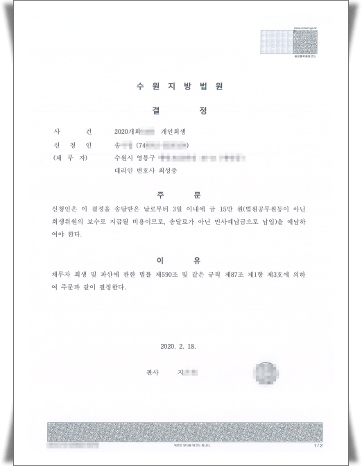 ¼ö¿øÁö¹æ¹ý¿ø °³ÀÎȸ»ý ¿ÜºÎȸ»ýÀ§¿øº¸¼ö ¿¹³³¸í·É°áÁ¤ ¡ß »ý ³â : 1974³â »ý¡ß °ÅÁÖÁö : ¼ö¿ø½Ã ¿µÅ뱸¡ß ¹Î»ç¿¹³³±Ý : 15¸¸¿ø¡ß ¿¹³³°áÁ¤»çÀ¯ : ¿µ¾÷¼ÒµæÀÚ¡ß ¿ÜºÎȸ»ýÀ§¿ø¼±ÀÓ¿©ºÎ : ¿ÜºÎȸ»ýÀ§¿ø¼±ÀÓ¡ß °áÁ¤ÀÇ ³»¿ë : °³Àλç¾÷À» ÇÏ´Â ½ÅûÀÎÀº »ç¾÷ÀåÀÌ Àß ¿î¿µµÇÁö ¾Ê°í, ´Ã¾î¸¸ °¡´Â ºÎ並 ÇØ°áÇÒ ¹æ¹ýÀÌ ¾ø¾î ºÎµæÀÌ ¼ö¿øÁö¹æ¹ý¿ø¿¡ °³ÀÎȸ»ýÀ» ½ÅûÇÏ¿´½À´Ï´Ù. ¼ö¿øÁö¹æ¹ý¿øÀº ½ÅûÀÎÀÇ »ç°ÇÀ» ¿ÜºÎȸ»ýÀ§¿ø¿¡ ¹è´çÇϱâ À§ÇØ ¾Æ·¡¿Í °°ÀÌ ¹Î»ç¿¹³³±ÝÀ» ³³ºÎÇ϶ó´Â °áÁ¤À» ÇÏ¿´½À´Ï´Ù.