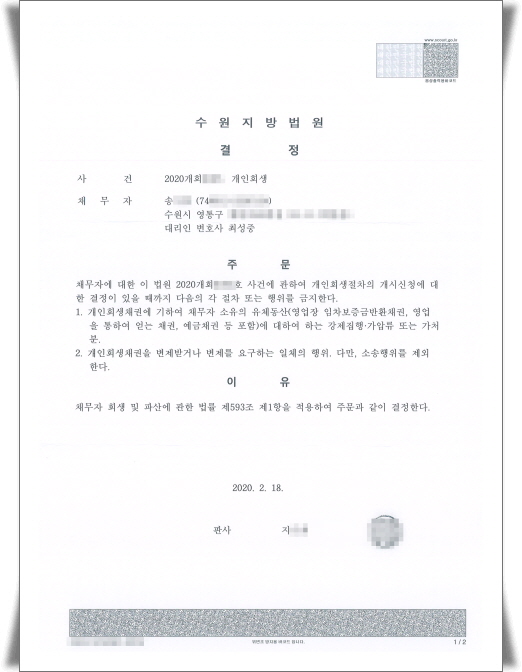 ¼ö¿øÁö¹æ¹ý¿ø °³Àλç¾÷ÀÚ ±ÝÁö¸í·É°áÁ¤ ¡ß »ý ³â : 1974³â »ý¡ß ÁÖ¼ÒÁö : ¼ö¿ø½Ã ¿µÅ뱸¡ß ¼ÒµæÈ°µ¿ : ÀÚ¿µ¾÷ÀÚ¡ß °üÇÒ¹ý¿ø : ¼ö¿øÁö¹æ¹ý¿ø ¡ß ƯÀÌ»çÇ× : ½ÅûÀÎÀº ÀÛÀº »ç¾÷ÀåÀ» ¿î¿µÇϰí ÀÖ´Â °³Àλç¾÷ÀÚÀÔ´Ï´Ù. ±×·¡¼ ±Ù·Î¼ÒµæÀÌ ¾Æ´Ñ ¿µ¾÷¼ÒµæÀ» °¡Áö°í º¯Á¦°èȹÀ» ¼öÇàÇÏ´Â ¿µ¾÷¼ÒµæÀÚ °³ÀÎȸ»ýÀ» ½ÅûÇÏ¿´À¸¸ç, ä±ÇÀÚÀÇ Ã¤¹«µ¶Ã˰ú ¿µ¾÷À» ÅëÇÏ¿© ¾ò´Â ä±Ç(¼Òµæ), »ç¾÷¿ë°èÁÂ(¿¹±Ýä±Ç)¾Ð·ù µîÀ» ¹æÁöÇϱâ À§ÇØ °³ÀÎȸ»ý½Åû°ú µ¿½Ã¿¡ ±ÝÁö¸í·É½ÅûÀ» ÇÏ¿´½À´Ï´Ù.