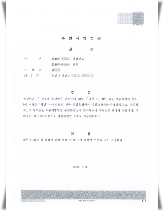 ¡ß °áÁ¤ÀÇ ³»¿ë : ¿ëÀνÿ¡ °ÅÁÖÇϴ ä¹«ÀÚ´Â ¼ö¿øÁö¹æ¹ý¿øÀÌ °üÇÒ¹ý¿øÀÔ´Ï´Ù. ¼ö¿øÁö¹æ¹ý¿ø¿¡¼´Â 乫ÀÚ¿¡ ´ëÇÑ ÆÄ»ê¼±°í¿¡ ¾Õ¼ ÆÄ»êÀýÂ÷ºñ¿ë(ÆÄ»ê°üÀçÀκ¸¼ö)À¸·Î »ç¿ëÇÒ ¹Î»ç¿¹³³±ÝÀ¸·Î 30¸¸¿øÀ» ³³ÀÔÇ϶ó´Â °áÁ¤À» ÇÏ¿´½À´Ï´Ù.