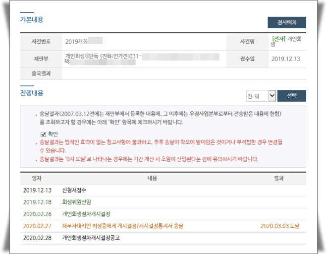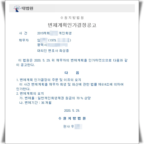 ÇÏÁö¸¸ ÀúÈñ ÃÖ¼ºÁß ¹ý·ü»ç¹«¼Ò¿¡¼´Â °³ÀÎȸ»ý½Åû¼ ÀÛ¼º½Ã ºÎÅÍ ¹Ì¸® ¹®Á¦°¡ µÉ¸¸ÇÑ Á¡À» ¸ðµÎ ¼Ò¸íÇÑ ¼¸éÀ» Á¦ÃâÇÏ¿´°í, ¼ö¿øÁö¹æ¹ý¿ø¿¡¼´Â º¸Á¤±Ç°í ¾øÀÌ »ç°Ç Á¢¼ö ÈÄ 2°³¿ù 15ÀÏ ¸¸¿¡ °³ÀÎȸ»ýÀýÂ÷°³½Ã°áÁ¤À» ÇÏ¿´½À´Ï´Ù.