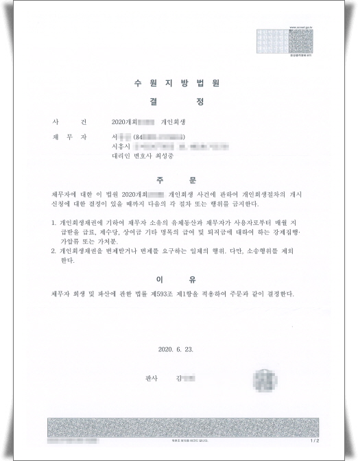 ½ÅûÀÎÀº ÀÏ¹Ý È¸»ç¿øÀ¸·Î ÀÏÀ» ÇÏ¸ç ¾ò´Â ¼ÒµæÀ¸·Î ¼ö¿øÁö¹æ¹ý¿ø¿¡ °³ÀÎȸ»ý½ÅûÀ» ÇÏ¿´½À´Ï´Ù. ä±ÇÀÚµé·Î ºÎÅÍ Ã¤¹«µ¶ÃËÀÌ ÀÖÀ¸¸é Á¤»óÀûÀÎ »ýȰ°ú ±Ù·ÎȰµ¿¿¡ ÀúÇØ ¿ä¼Ò°¡ µÉ ¼ö Àֱ⠶§¹®¿¡ °³ÀÎȸ»ý½Åû½Ã ¼ö¿øÁö¹æ¹ý¿ø¿¡ ±ÝÁö¸í·É½ÅûÀ» ÇÏ¿´°í, ¼ö¿øÁö¹æ¹ý¿ø¿¡¼´Â ½ÅûÀÎÀÇ ±ÝÁö¸í·É½Åû¿¡ ´ëÇÏ¿© "乫ÀÚ ¼ÒÀ¯ÀÇ À¯Ã¼µ¿»ê°ú 乫ÀÚ°¡ »ç¿ëÀڷκÎÅÍ ¸Å¿ù Áö±Þ¹ÞÀ» ±Þ·á, Á¦¼ö´ç, »ó¿©±Ý ±âŸ ¸í¸ñÀÇ ±Þ¿© ¹× ÅðÁ÷±Ý¿¡ ´ëÇÏ¿© ÇÏ´Â °Á¦ÁýÇà, °¡¾Ð·ù, °¡Ã³ºÐ°ú "°³ÀÎȸ»ýä±ÇÀ» º¯Á¦¹Þ°Å³ª º¯Á¦¸¦ ¿ä±¸ÇÏ´Â ÀÏüÀÇ ÇàÀ§" ¸¦ ±ÝÁöÇÑ´Ù." ¶ó´Â °áÁ¤À» ÇÏ¿´½À´Ï´Ù.