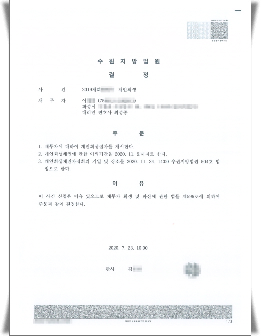 ½ÅûÀÎÀ¸·Î¼´Â ³²Àº ´ëÃâ±Ý°ú ÀÓÂ÷Àο¡°Ô ¹ÝȯÇÏ¿©¾ß ÇÒ º¸Áõ±ÝÀ» º¯Á¦ÇÒ ¹æ¹ýÀÌ ¾ø¾î ºÎµæÀÌ ¼ö¿øÁö¹æ¹ý¿ø¿¡ °³ÀÎȸ»ý½ÅûÀ» ÇÏ°Ô µÇ¾ú°í, ¼ö¿øÁö¹æ¹ý¿ø¿¡¼´Â ¾Æ·¡¿Í °°ÀÌ °³ÀÎȸ»ý°³½Ã°áÁ¤À» ÇÏ¿´½À´Ï´Ù.