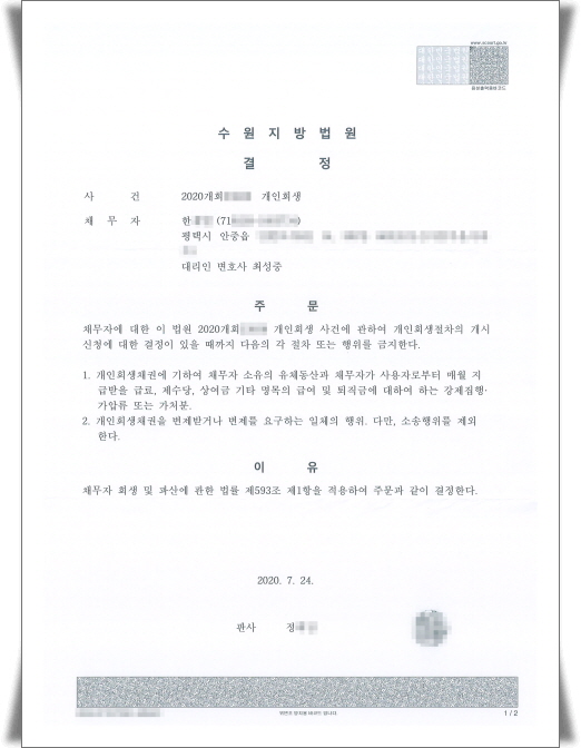 ¼ö¿øÁö¹æ¹ý¿ø ±ÝÁö¸í·É°áÁ¤ ¡ß »ý ³â : 1971³â »ý¡ß ÁÖ¼ÒÁö : ÆòÅýà ¾ÈÁßÀ¾¡ß ¼ÒµæÈ°µ¿ : ȸ»ç¿ø¡ß °üÇÒ¹ý¿ø : ¼ö¿øÁö¹æ¹ý¿ø ¡ß ƯÀÌ»çÇ× : ½ÅûÀÎÀº ¾ÈÁßÀ¾¿¡ °ÅÁÖÇÏ´Â ºÐÀ¸·Î ¼ö¿øÁö¹æ¹ý¿øÀÌ °³ÀÎȸ»ý½Åû °üÇÒ¹ý¿øÀÔ´Ï´Ù. ½ÅûÀÎÀº °³Àλç¾÷ ½ÇÆÐ·Î »ç¾÷ÀåÀ» Æó¾÷ÇÏ°Ô µÇ¾ú½À´Ï´Ù. °¡Á·À» ºÎ¾çÇØ¾ß ÇÏ´Â °¡ÀåÀÌ´Ù º¸´Ï ¼µÑ·¯ Ãë¾÷À» ÇÏ°í °æÁ¦È°µ¿À» ½ÃÀÛÇßÁö¸¸, °¡Á·À» ºÎ¾çÇÏ¸é¼ »ç¾÷½ÇÆÐ·Î ¹ß»ýÇÑ Ã¤¹«¸¦ °±±â¿¡´Â ¿ªºÎÁ·À̾ú½À´Ï´Ù.