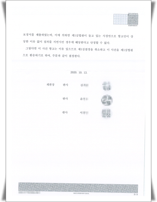 Ç×°í¹ý¿ø¿¡¼´Â ÀúÈñ »ç¹«½Ç¿¡¼ º¸Á¤¼¸¦ Á¦ÃâÇÏÀÚ Ç×°íÀÎÀÌ »ó´çÇÑ ÀÌÀ¯ ¾øÀÌ ÀýÂ÷¸¦ Áö¿¬½ÃŲ °æ¿ì¿¡ ÇØ´çÇÑ´Ù°í ´ÜÁ¤ÇÒ ¼ö ¾ø´Ù°í º¸¾Æ Á¦1½É°áÁ¤À» Ãë¼ÒÇϰí, »ç°ÇÀ» ´Ù½Ã Á¦1½É¹ý¿øÀ¸·Î ȯ¼ÛÇÏ¿´½À´Ï´Ù.