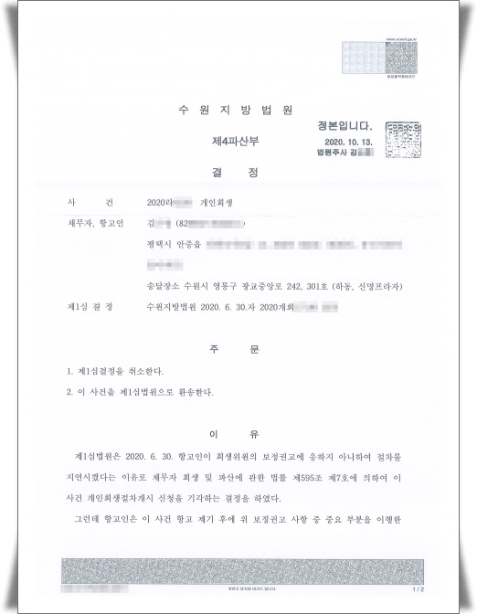 ¡ß ±â°¢°áÁ¤¿¡ ´ëÇÑ Áï½ÃÇ×°í °á°ú : °³ÀÎȸ»ýÀýÂ÷ ±â°¢°áÁ¤ Ãë¼Ò°áÁ¤¡ß Áï½ÃÇ×°í¿¡ À̸£°Ô µÈ »çÀ¯ : ÀÇ·ÚÀÎÀº ÆòÅýà ¾ÆÁßÀ¾¿¡ °ÅÁÖÇÏ´Â ºÐÀ¸·Î ¼ö¿øÁö¹æ¹ý¿ø¿¡ °³ÀÎȸ»ýÀ» ½ÅûÇßÀ¸³ª ȸ»ýÀ§¿øÀÇ º¸Á¤±Ç°í¿¡ ÀÀÇÏÁö ¾Æ´ÏÇÏ¿© ÀýÂ÷¸¦ Áö¿¬½ÃÄ×´Ù´Â ÀÌÀ¯·Î 乫ÀÚ È¸»ý ¹× ÆÄ»ê¿¡ °üÇÑ ¹ý·ü Á¦595Á¶ Á¦7È£¿¡ ÀÇÇÏ¿© °³ÀÎȸ»ýÀýÂ÷°³½Ã½Åû ±â°¢°áÁ¤À» ¹Þ¾Ò½À´Ï´Ù¤Ó.