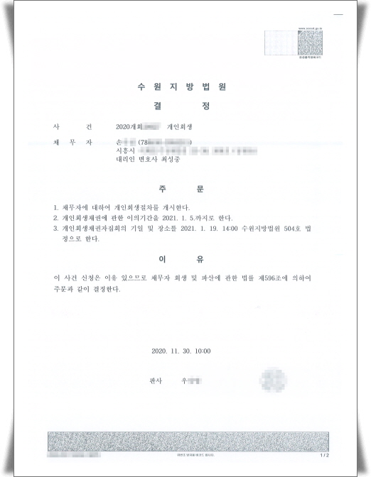 ¼ö¿øÁö¹æ¹ý¿ø¿¡¼´Â ÀÇ·ÚÀÎÀÌ ½ÅûÇÑ °³ÀÎȸ»ý»ç°Ç¿¡ ´ëÇÏ¿© ¾Æ·¡¿Í °°ÀÌ °³ÀÎȸ»ýÀýÂ÷¸¦ °³½ÃÇÑ´Ù¶ó´Â °áÁ¤À» ÇÏ¿´½À´Ï´Ù.