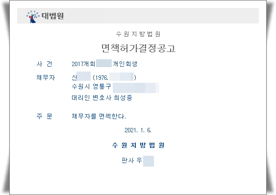 ¡ß °³ÀÎȸ»ý ¸éÃ¥Çã°¡°áÁ¤ÀÏ : 2021. 1. 6.¡ß °³ÀÎȸ»ý ¸éÃ¥Çã°¡°áÁ¤°ø°íÀÏ : 2021. 1. 6.¡ß ƯÀÌ»çÇ× : ÀÇ·ÚÀÎÀº °³ÀÎȸ»ýÀ» ½ÅûÇϰí Áö³ 3³â°£ º¯Á¦ÀÇ ¼öÇàÀ» ¿Ï·áÇÑ ÈÄ ¼ö¿øÁö¹æ¹ý¿ø¿¡ °³ÀÎȸ»ý ¸éÃ¥½ÅûÀ» ÇÏ¿´½À´Ï´Ù. ¡ß °³ÀÎȸ»ý ¸éÃ¥½Åû : ÀÇ·ÚÀÎÀº °³ÀÎȸ»ý º¯Á¦°èȹ¾È¿¡¼ Á¤ÇØÁø ±â°£µ¿¾È º¯Á¦¸¦ ¿Ï·á ÇÑ ÈÄ ¹Ù·Î ¼ö¿øÁö¹æ¹ý¿ø¿¡ °³ÀÎȸ»ý¸éÃ¥½ÅûÀ» ÇÏ¿´½À´Ï´Ù. ¸éÃ¥½Åû ÈÄ ¸éÃ¥°áÁ¤±îÁö ¾à 2~3°³¿ùÀÌ ¼Ò¿äµÇ±â ¶§¹®¿¡ ¸¶Áö¸· ȸÂ÷¸¦ ³³ºÎÇÏ¼Ì´Ù¸é ¹Ù·Î ¸éÃ¥½ÅûÀ» ÇÏ½Ã´Â°Ô ÁÁ½À´Ï´Ù.