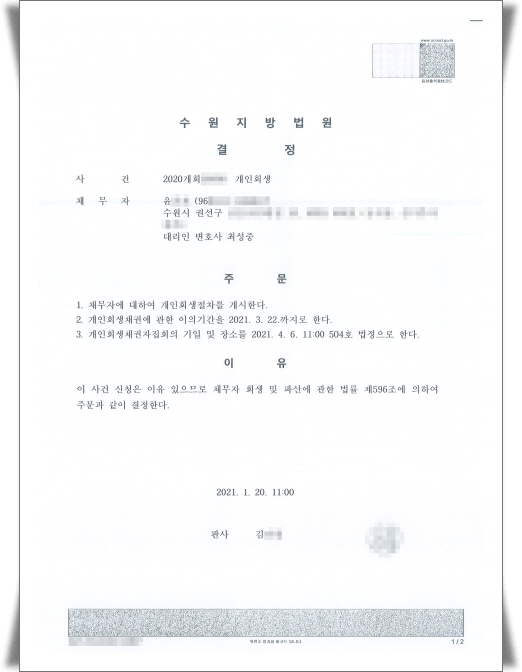 ¼ö¿øÁö¹æ¹ý¿ø¿¡¼´Â ÀÇ·ÚÀÎÀÌ ½ÅûÇÑ °³ÀÎȸ»ý»ç°Ç¿¡ ´ëÇÏ¿© ¾Æ·¡¿Í °°ÀÌ °³ÀÎȸ»ýÀýÂ÷¸¦ °³½ÃÇÑ´Ù¶ó´Â °áÁ¤À» ÇÏ¿´½À´Ï´Ù.