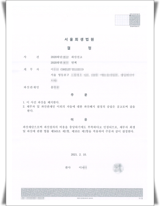 ¼¿ïȸ»ý¹ý¿ø ÆÄ»êÆóÁö°áÁ¤ ¡ß »ý ³â : 1958³â»ý¡ß °ÅÁÖÁö : ¼¿ï½Ã ¿µµîÆ÷±¸¡ß ÆÄ»êÆóÁö°áÁ¤°ø°íÀÏ : 2021. 2. 10.¡ß ÆÄ»ê°üÀçÀμ±ÀÓ¿©ºÎ : ÆÄ»ê°üÀçÀμ±ÀÓ ¡ß ÁøÇà»çÇ× : ½ÅûÀÎÀº ¼¿ï ¿µµîÆ÷±¸¿¡ °ÅÁÖÇϽô ºÐÀ¸·Î ¼¿ïȸ»ý¹ý¿øÀÌ °³ÀÎÆÄ»ê½Åû °üÇÒ¹ý¿øÀÔ´Ï´Ù. »ó´ã Àüȸ¦ ¹Þ´Ù º¸¸é ÆÄ»êÆóÁö°áÁ¤À» ¹Þ°í ÆÄ»ê½ÅûÀÌ ÆóÁöµÈ °ÍÀ¸·Î ¿ÀÇØ¸¦ ÇϽô ºÐµéÀÌ ¸¹½À´Ï´Ù.
