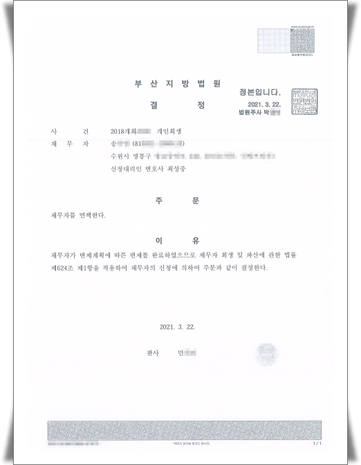 ¡ß ƯÀÌ»çÇ× : ºÎ»êÁö¹æ¹ý¿ø¿¡¼ ÁøÇàÇÑ °³ÀÎȸ»ý ¼º°ø»ç·ÊÀÔ´Ï´Ù. ÀÌ »ç°ÇÀº º¯Á¦°èȹ¿¡ µû¸¥ º¯Á¦¸¦ ¿Ï·áÇÏ°í ºÎ»êÁö¹æ¹ý¿ø¿¡ °³ÀÎȸ»ý ¸éÃ¥½ÅûÀ» ÇÏ¿© ¸éÃ¥°áÁ¤À» ¹ÞÀº »ç°ÇÀÔ´Ï´Ù. ºÎ»êÁö¹æ¹ý¿ø¿¡¼´Â ¸éÃ¥°áÁ¤¹®À» ¼Û´ÞÇϰí ÀÌ¾î ¸éÃ¥°áÁ¤À» °ø°íÇÏ¿´½À´Ï´Ù.