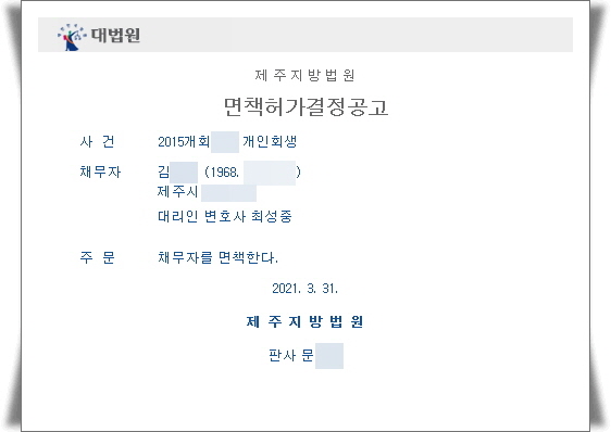 ¡ß °³ÀÎȸ»ý ¸éÃ¥Çã°¡°áÁ¤ÀÏ : 2021. 3. 31.¡ß °³ÀÎȸ»ý ¸éÃ¥Çã°¡°áÁ¤°ø°íÀÏ : 2021. 3. 31.¡ß ƯÀÌ»çÇ× : 2015³â¿¡ Á¦ÁÖÁö¹æ¹ý¿ø¿¡ ½ÅûÇÑ °³ÀÎȸ»ý»ç°ÇÀÔ´Ï´Ù. ´ç½Ã °³ÀÎȸ»ý º¯Á¦±â°£Àº 5³â°£ º¯Á¦¸¦ ¿Ï·áÇÏ°í ³ª¼ ³ª¸ÓÁö º¯Á¦ÇÏÁö ¸øÇÑ Ã¤¹«¸¦ ÅÁ°¨ ¹Þ±â À§ÇØ ¸éÃ¥½ÅûÀ» ÇÏ¿´½À´Ï´Ù.