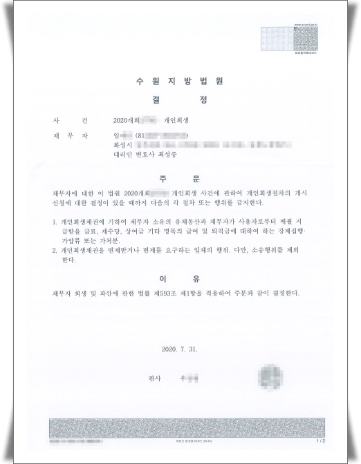 ´ÙÇàÈ÷ ´ÊÁö ¾Ê°Ô ÀúÈñ »ç¹«½Ç¿¡ ã¾Æ¿À¼Å¼ °³ÀÎȸ»ý»ó´ã ÈÄ ¼ö¿øÁö¹æ¹ý¿ø¿¡ °³ÀÎȸ»ýÀ» ½Åû°ú µ¿½Ã¿¡ ±ÝÁö¸í·É½ÅûÀ» Çß½À´Ï´Ù. ÀÌÈÄ ¼ö¿øÁö¹æ¹ý¿øÀÇ ±ÝÁö¸í·É °áÁ¤À» ¹Þ¾Æ ä±ÇÀÚµéÀÇ Ã¤¹«µ¶ÃËÀ» ¸·°í °³ÀÎȸ»ýÀýÂ÷¸¦ ÁøÇàÇÏ¿© ¾Æ·¡¿Í °°ÀÌ º¯Á¦°èȹÀΰ¡°áÁ¤À» ¹Þ¾Ò½À´Ï´Ù.
