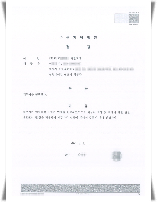 ¡ß °³ÀÎȸ»ý ¸éÃ¥½Åû : °³ÀÎȸ»ý º¯Á¦¸¦ ¿Ï·áÇÑ ÈÄ ¸éÃ¥°áÁ¤À» ¹Þ¾Æ¾ß 乫°¡ ÀüºÎ ¸éÃ¥µÇ±â ¶§¹®¿¡ º¯Á¦ ¿Ï·á¿Í µ¿½Ã¿¡ ¼µÑ·¯ ¼ö¿øÁö¹æ¹ý¿ø¿¡ ¸éÃ¥½ÅûÀ» Çϰí, ¾Æ·¡¿Í °°ÀÌ Ã¤¹«ÀÚ¸¦ ¸éÃ¥ÇÑ´Ù´Â °áÁ¤À» ¹Þ¾Ò½À´Ï´Ù.