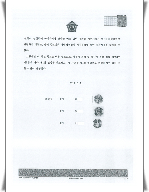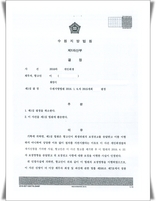 Áï, »ç°ÇÀ» ÁøÇàÀ» ÇÏ´Ù°¡ °á±¹ ¹ý¿øÀÇ º¸Á¤¸í·É¿¡ µû¶ó º¸Á¤ÇÏÁö ¸øÇÏ¿© °á±¹ °³ÀÎȸ»ýÀýÂ÷°¡ ÆóÁöµÇ¾ú°í, ÆóÁöµÈ »ç°ÇÀ» ÀúÈñ »ç¹«½Ç¿¡¼ ¸Ã¾Æ 2½É Ç×°í¼Ò¼ÛÀ» ÇÏ¿© ´Ù½Ã 1½ÉÀ¸·Î ȯ¼ÛµÈ »ç°ÇÀÔ´Ï´Ù. Á¤¸®ÇÏÀÚ¸é 1½É¿¡¼ ÆóÁöÇÑ °³ÀÎȸ»ý»ç°ÇÀ» ´Ù½Ã ÁøÇàÇÒ ¼ö ÀÖ°Ô µÈ °ÍÀÌÁÒ.