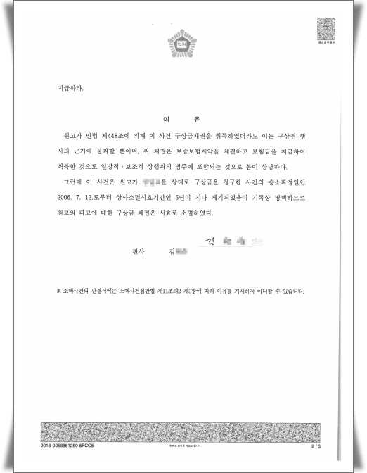 ÆÇ°á¹®ÀÇ ³»¿ëÀ» ¿ä¾àÇϸé, ä±ÇÀÚ(º¸Çè»ç)°¡ º¸Áõº¸Çè°è¾à¿¡ µû¶ó ±¸»ó±Ýä±ÇÀ» ÃëµæÇÏ¿´´Ù ÇÏ´õ¶óµµ ÀÌ´Â ÀϹæÀû, º¸Á¶Àû »óÇàÀ§ÀÇ ¹üÁÖ¿¡ Æ÷ÇԵǴ °ÍÀ̹ǷΠ»ó»ç¼Ò¸ê½ÃÈ¿±â°£ 5³âÀ» Àû¿ëÇÑ´Ù´Â ³»¿ëÀÔ´Ï´Ù.