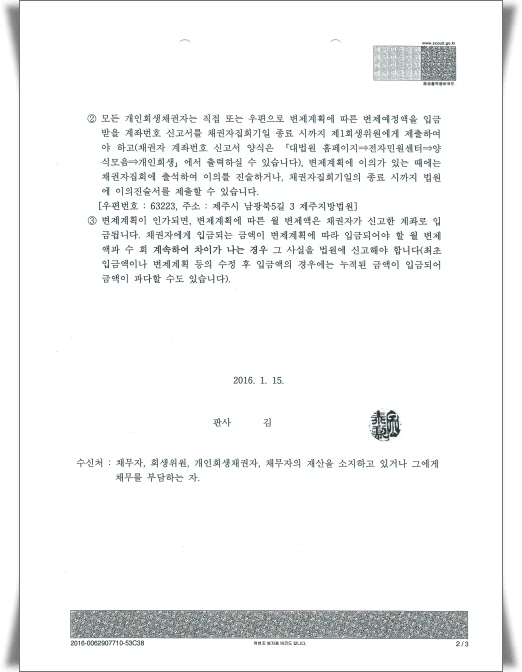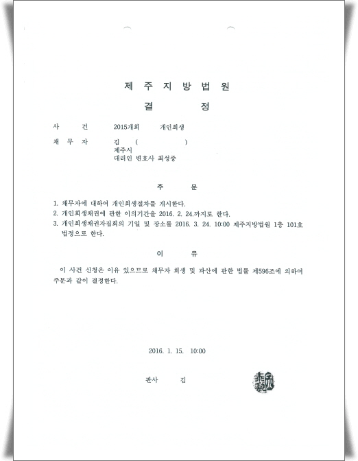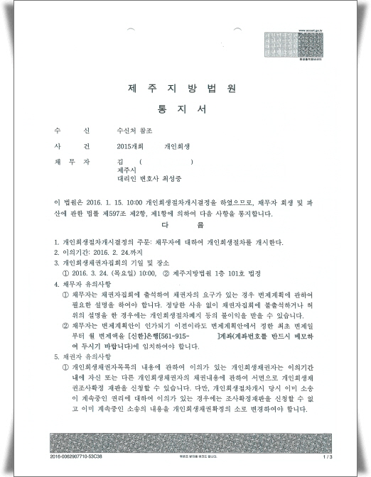 ¹ý¿ø¿¡ °³ÀÎȸ»ýÀ» ½ÅûÇÏ¿© °³½Ã°áÁ¤ÀÌ ³ª¸é ¹ý¿øÀ¸·ÎºÎÅÍ °³ÀÎȸ»ýÀýÂ÷¸¦ °³½ÃÇÑ´Ù´Â °áÁ¤¹®°ú 乫ÀÚÀÇ À¯ÀÇ»çÇ× ¹× ³³ºÎ°èÁ µîÀ» ¼³¸íÇÏ´Â ÅëÁö¼­¸¦ ¹Þ½À´Ï´Ù.