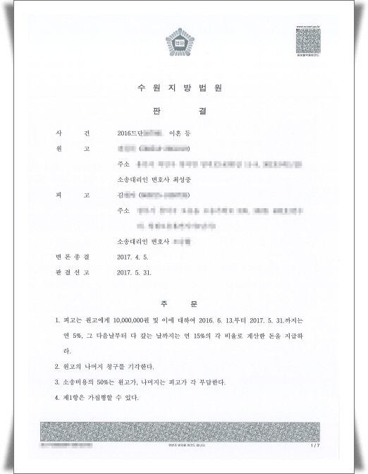±×·¡¼ ÀúÈñ »ç¹«½Ç¿¡¼ ¹è¿ìÀÚ¸¦ »ó´ë·Î ÀÌÈ¥¼Ò¼ÛÀ» ÁøÇàÇÏ¸é¼ ¹è¿ìÀÚ¿Í ºÎÁ¤ÇàÀ§¸¦ ÇÑ »ó´ë¹æ ¿©¼ºÀ» »ó´ë·Î À§ÀÚ·á(¼ÕÇØ¹è»ó) û±¸¸¦ ÇÏ¿´½À´Ï´Ù.