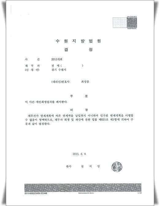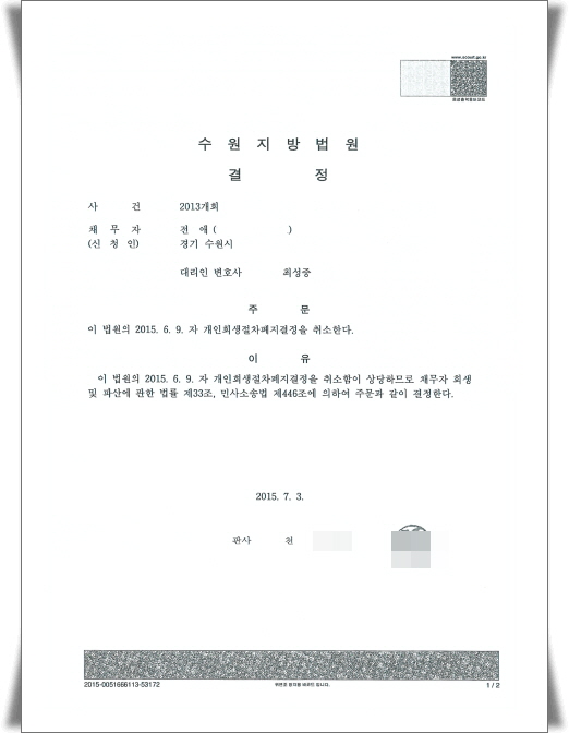 °³ÀÎȸ»ýÀ» ÁøÇàÇϽôٰ¡ º¯Á¦°èȹ¿¡ µû¸¥ º¯Á¦±ÝÀ» ³³ÀÔÇÏÁö ¾Æ´ÏÇÏ¿© °³ÀÎȸ»ýÀýÂ÷°¡ ÆóÁö µÇ¾ú´ø »ç°ÇÀÔ´Ï´Ù. ¹ý¿øÀÇ ÆóÁö°áÁ¤ÀÌ ÀÖÀº ÈÄ ¹Ù·Î Áï½ÃÇ×°í¸¦ ÇÏ¿© ¹ý¿øÀ¸·ÎºÎÅÍ °³ÀÎȸ»ýÀýÂ÷ÆóÁö°áÁ¤À» Ãë¼ÒÇÑ´Ù´Â °áÁ¤À» ¹Þ¾Ò½À´Ï´Ù.