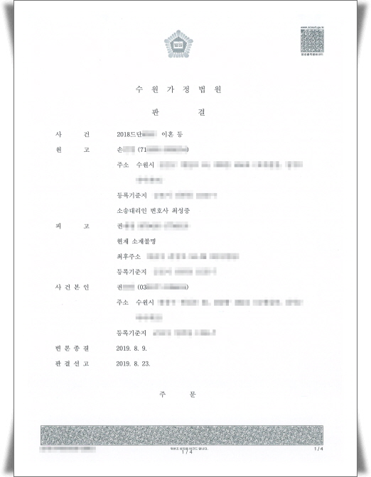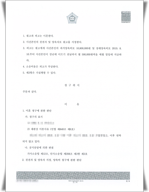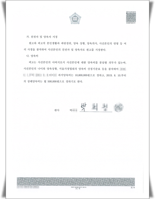 °¡Á¤¹ý¿ø¿¡¼­´Â ¿ø°í¿Í ÇÇ°í°¡ ÀÌÈ¥ÇÑ´Ù´Â °áÁ¤°ú ÇÔ²² ÀÚ³àÀÇ Ä£±ÇÀÚ ¹× ¾çÀ°±ÇÀÚ·Î ¿ø°í¸¦ ÁöÁ¤Çϰí, ÇÇ°í¿¡°Ô °ú°ÅÀÇ ¾çÀ°ºñ´Â 10,800,000¿øÀ», Àå·¡ÀÇ ¾çÀ°ºñ´Â Àڳడ ¼º³â¿¡ À̸£±â ±îÁö ¸Å¿ù 500,000¿øÀ» Áö±ÞÇ϶ó´Â °áÁ¤À» ÇÏ¿´½À´Ï´Ù.