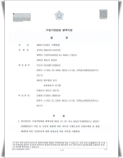 Á¦¸ñ °¡»ç¼Ò¼Û - ¸éÁ¢±³¼· ÀÌÇàû±¸ (ÀÌÈ¥ ¼Ò¼Û ÈÄ »ó´ë¹æÀÌ ÀÚ³àÀÇ ¸éÁ¢±³¼·À» ¹æÇØÇÏ´Â °æ¿ì)