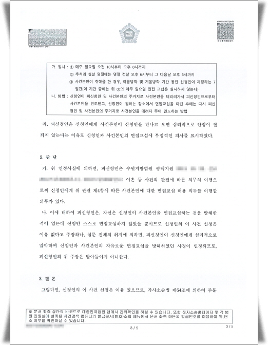 ¼ö¿ø°¡Á¤¹ý¿ø¿¡¼­´Â »ó´ë¹æÀÌ ½ÅûÀο¡°Ô ½É¸®ÀûÀ¸·Î ¾Ð¹ÚÇÏ¿© ½ÅûÀΰú ÀÚ³àÀÇ ÀÚÀ¯·Î¿î ¸éÁ¢±³¼·À» ¹æÇØÇÏ¿´´ø »çÁ¤ÀÌ ÀÎÁ¤µÈ´Ù°í º¸¾Æ ½ÅûÀΰú Àڳ࿡ ´ëÇÑ ¸éÁ¢±³¼· Àǹ«¸¦ ÀÌÇàÇ϶ó´Â °áÁ¤À» ÇÏ¿´½À´Ï´Ù.